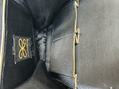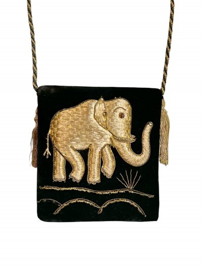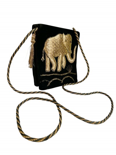 catifea brodata cu fir metalic, 13.3/14.5/6 cm, snur 116 cm, superba, conditie foarte buna
