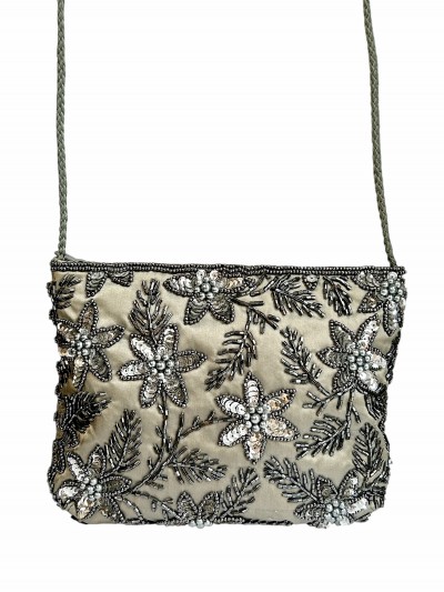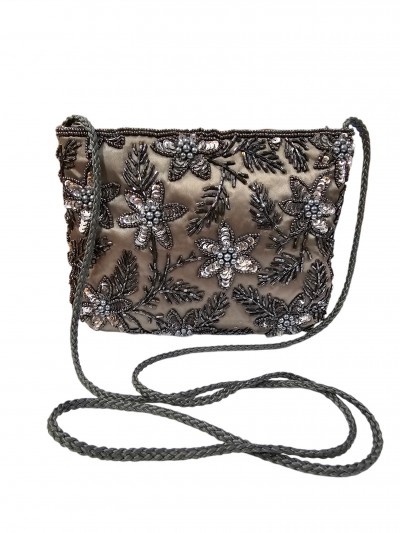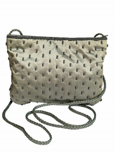 satin brodat cu paiete si margele din sticla, 19/14 cm, snur 122 cm, conditie excelenta
