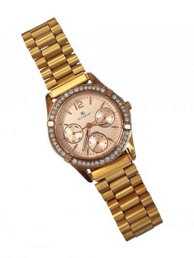 metal suflat cu aur roz, otel inoxidabil, diametru cadran 2.6 cm, lungime curea 22 cm, conditie excelenta, functional, baterie noua