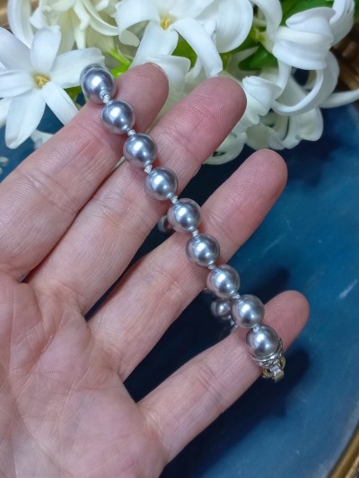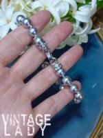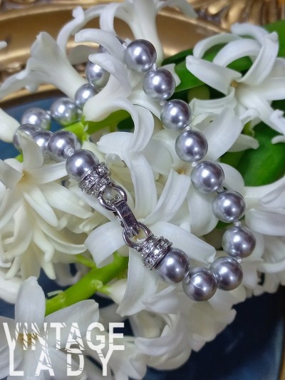 metal comun argintiu, cristale si perle gri, lungime 19.5 cm, conditie excelenta