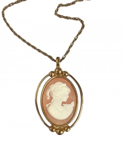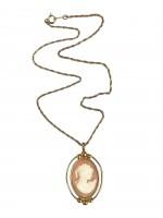 metal suflat cu aur si camee din rasina, lungime lant 43 cm, lungime pandant 4.3 cm, conditie excelenta