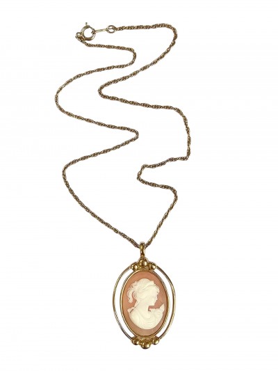 metal suflat cu aur si camee din rasina, lungime lant 43 cm, lungime pandant 4.3 cm, conditie excelenta